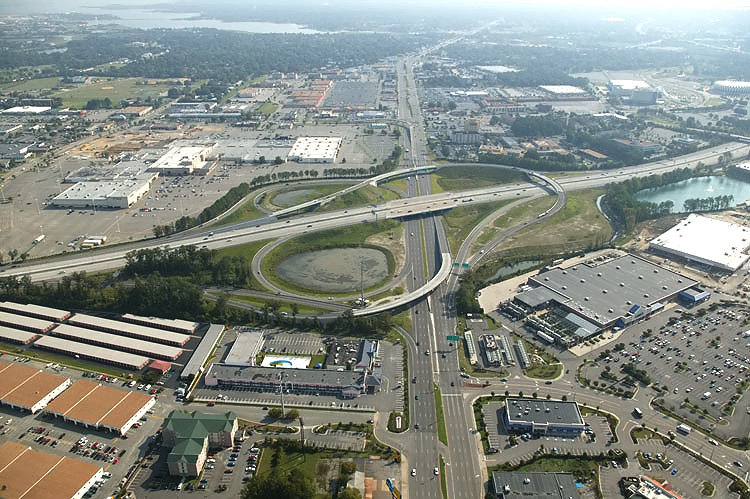 Reconstructed interchange of I-64 and Mercury Boulevard, looking northeast. Mercury Boulevard runs lower left to upper right, and I-64 runs upper left to lower right. |