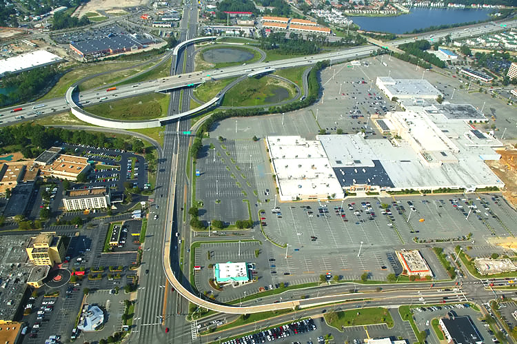 Reconstructed interchange of I-64 and Mercury Boulevard, looking west. Mercury Boulevard runs bottom to top, and I-64 runs left to right. Mercury Boulevard has a flyover ramp into the shopping mall access road, and that ramp was built over 20 years ago. The shopping mall in the right of the photo, is the Coliseum Mall. |