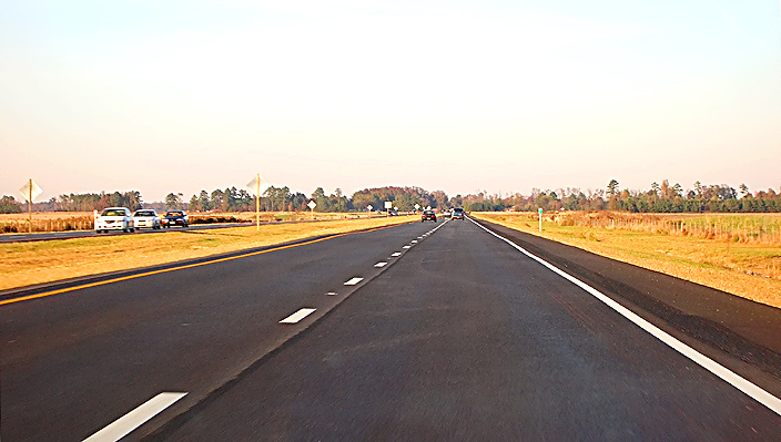 Roads to the Future took the following photos on November 12, 2005. A 2.2-x telephoto lens exaggerates the highway's curvature, as it is easily drivable at 60 mph. The new highway was driven in both directions a couple times, and it is very nice, with steady traffic and with ample room for the traffic volumes. The terrain is very flat and close to the water table, and the highway is typically elevated on embankment about 8 feet above the surrounding terrain, to assist in drainage and to prevent flooding of the highway. Nearly all of the old highway was open to motor vehicular traffic on the November 12th trip, and about 1/2 mile of new 2-lane parallel roadway remained to be constructed and opened at the seamless connection with pre-existing US-17 at the northern end of the project, and 2-lane 2-way traffic was using the new northbound roadway at that point; and the southern 1.3 miles of the project had construction underway on the southbound roadway with one lane open to traffic. All of the rest of the 2-lane northbound roadway and all of the rest of the 2-lane southbound roadway, and the Business US-17 connector, was fully open to traffic.